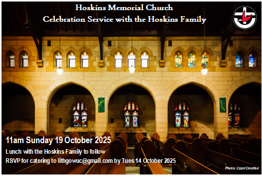 Hoskins Memorial Uniting Church 43 Bridge Street, Lithgow, NSW, AustraliaCombined worship service at Hoskins Memorial Uniting Church Lithgow, 11am Sunday 19th October 2025. Lunch to follow with the Hoskins Family. RSVP required 6351 3134, lithgowuc@gmail.com Guest Speaker Rev Andrew
